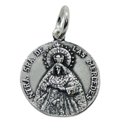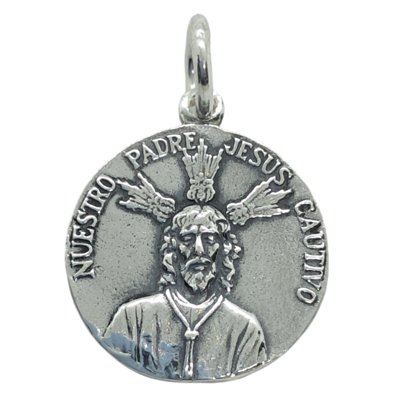 Medalla con imagen del Cautivo en relieve de forma redonda de plata de ley de 925 mls con unas medidas aproximadas de 19 mm.La parte trasera con imagen de la virgen de las Mercedes.