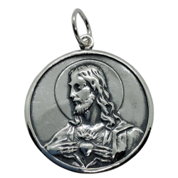 Medalla con imagen de Escapulario en relieve de forma redonda de plata de ley de 925 mls con unas medidas aproximadas de 28 mm.La parte trasera imagen Corazon de Jesus.