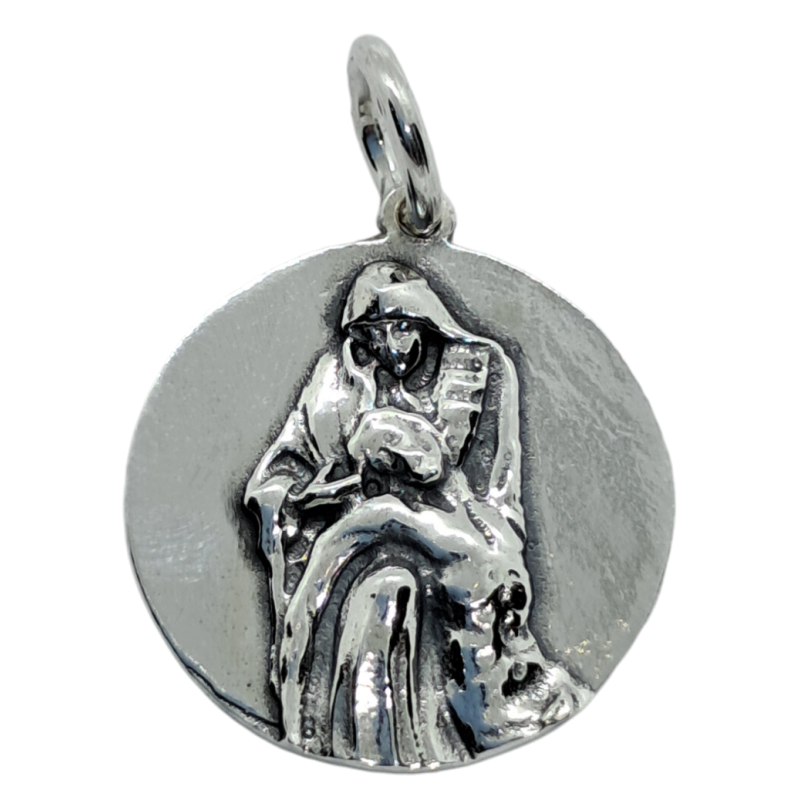 Medalla con imagen de Piedad en relieve de forma redonda de plata de ley de 925 mls con unas medidas aproximadas de 21 mm.La parte trasera es lisa.