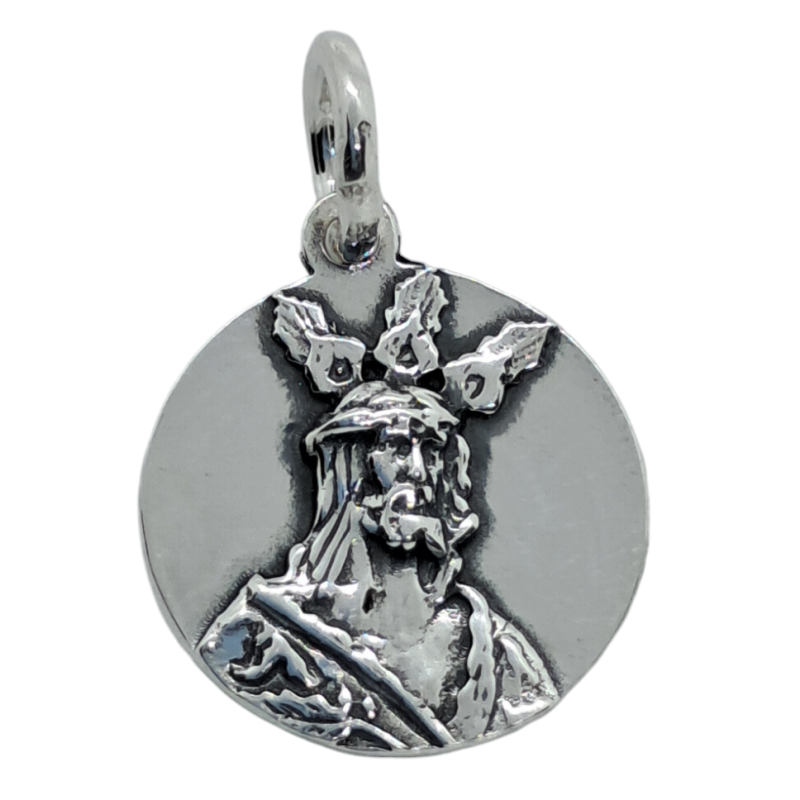 Medalla con imagen Sentencia en relieve de forma de plata de ley de 925 mls con unas medidas aproximadas de 18 mm.La parte trasera lisa.
