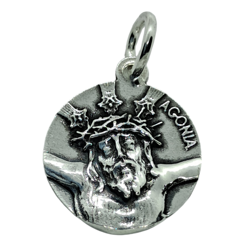 Medalla con imagen de Agonia en relieve de forma redonda de plata de ley de 925 mls, con unas medidas aproximadas de 18 mm.La parte trasera lisa.