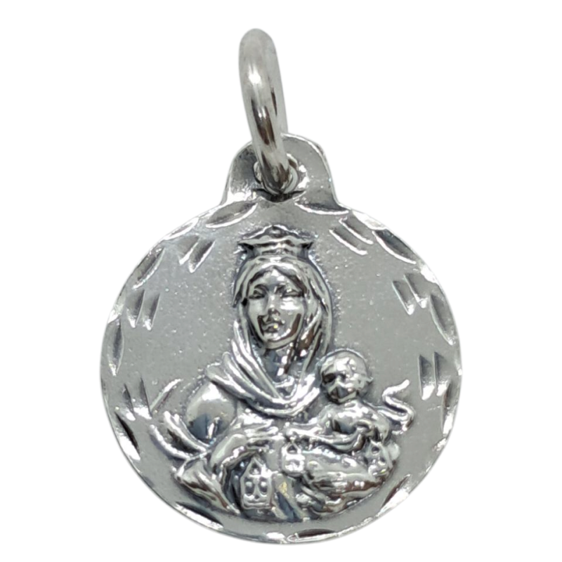 Medalla con imagen de Escapulario en relieve de forma redonda de plata de ley de 925 mls con unas medidas aproximadas de 19 mm.La parte trasera imagen Corazon de Jesus.