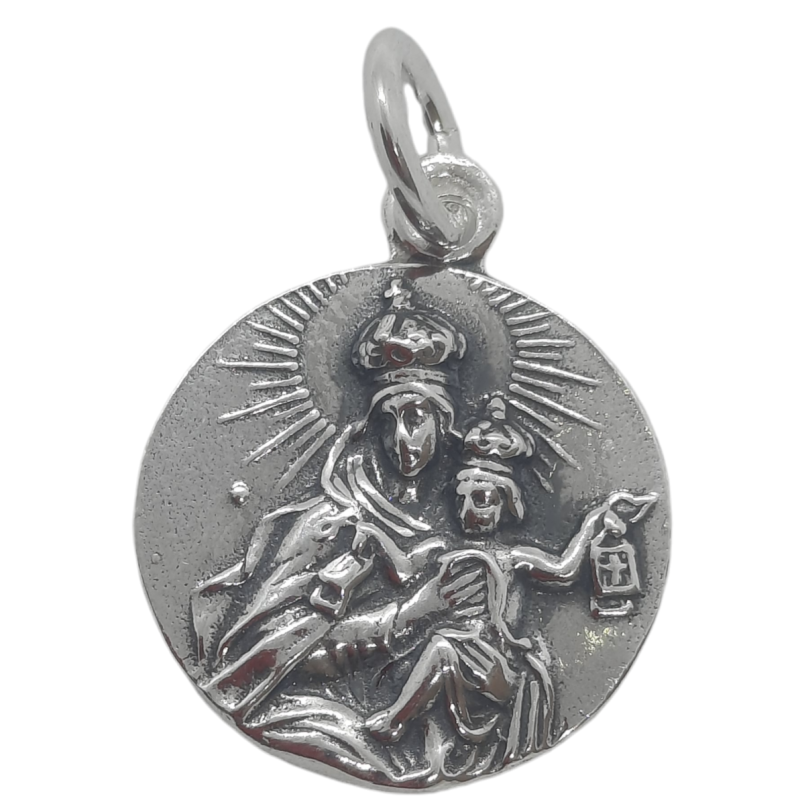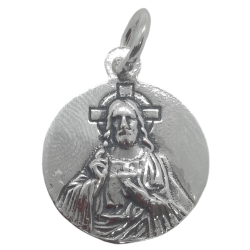 Medalla con imagen de Escapulario en relieve de forma redonda de plata de ley de 925 mls con unas medidas aproximadas de 18 mm.La parte trasera imagen Corazon de Jesus.