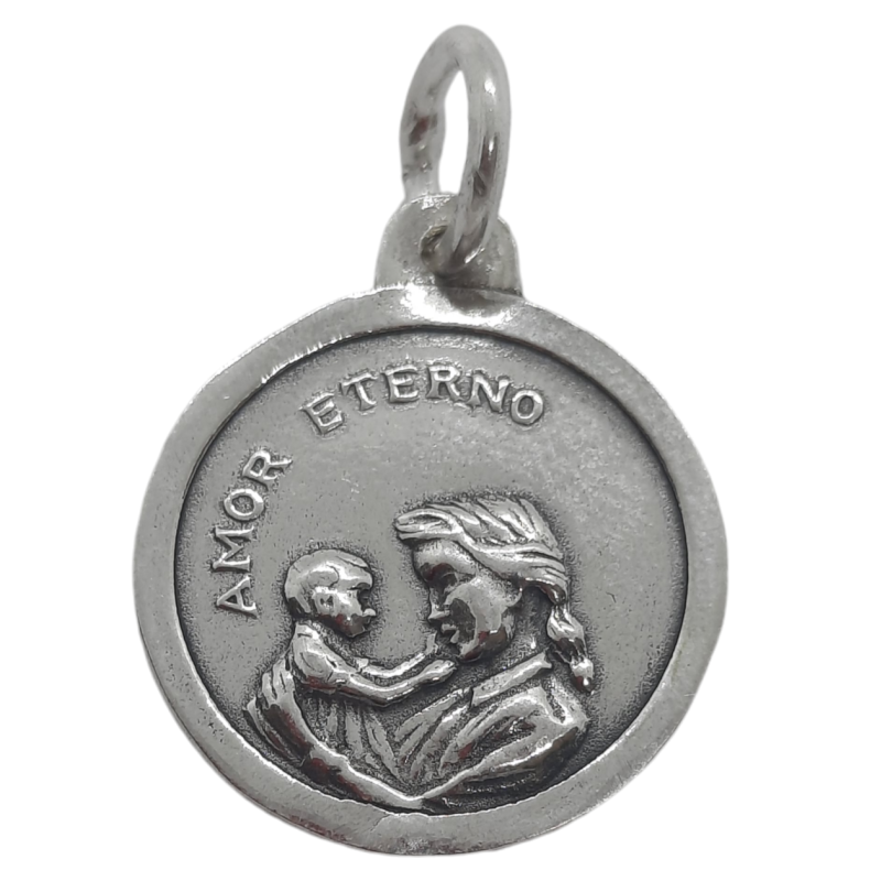 Medalla con imagen de Virgen Madre en relieve de forma redonda de plata de ley de 925 mls con unas medidas aproximadas de 19 mm.La parte trasera de la medalla es lisa.