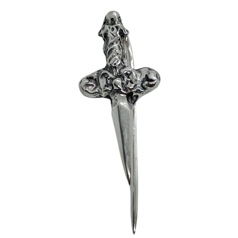 Alfiler Puñal de plata de ley de 925 mls con unas medidas aproximadas de 2,5 x 1,1 cm.